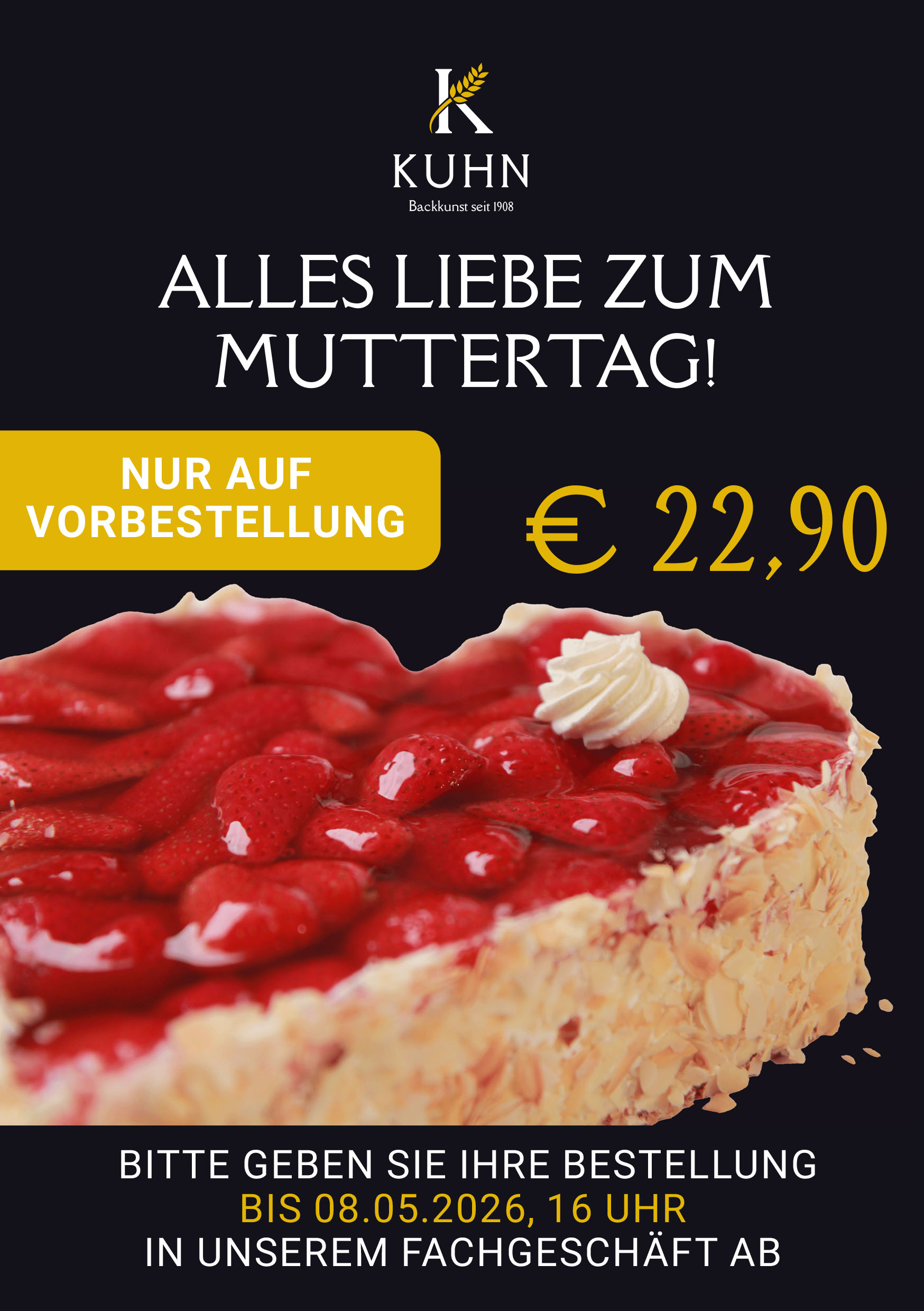 28. April 2026 Bald ist wieder Muttertag! Verwöhnen Sie Ihre Liebsten mit unserem schönen Erdbeerherz exklusiv zum Muttertag. Bestellen Sie bitte bis zum 08.05.2026 in unserem Fachgeschäft vor.